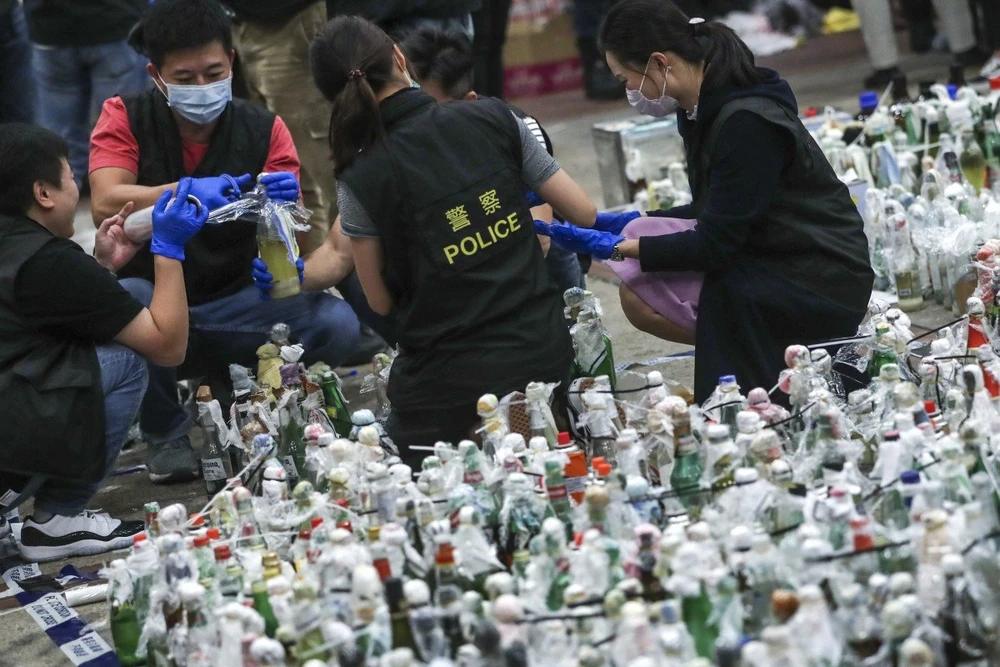 Tổng cộng 3.989 quả bom xăng, 1.339 thiết bị nổ và 601 chai chất lỏng ăn mòn được tìm thấy, trong khi 573 vũ khí đã bị thu giữ. Ảnh: SCMP