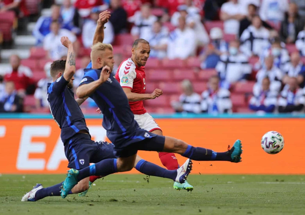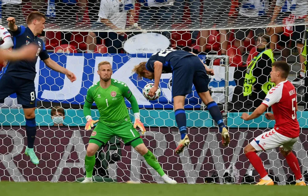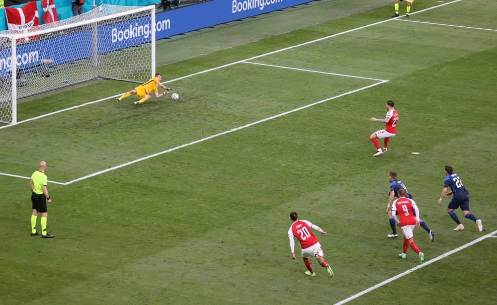 Phần Lan là đội lần đầu tham gia Euro, trong khi đó Đan Mạch lại là đội bất bại tại vòng loại. “Chú Lính Chì” sớm đẩy cao đội hình và áp đặt thế trận ngay sau tiếng còi khai cuộc. Chỉ trong khoảng 20 phút đầu trận, Đan Mạch đã tạo ra được 3 tình huống khiến thủ môn Hradecky của Phần Lan phải trổ tài cứu thua.