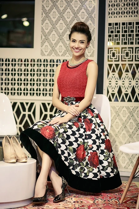Phần thân trên may kín đáo ôm sát người bằng lớp vải có những sợi thô ráp, xù xì, trong khi đó chân váy nổi bật với họa tiết hoa hồng kết hợp răng cưa. Để thêm bắt mắt, người đẹp phối thêm vòng cổ kết bằng những chuỗi hạt trơn màu.