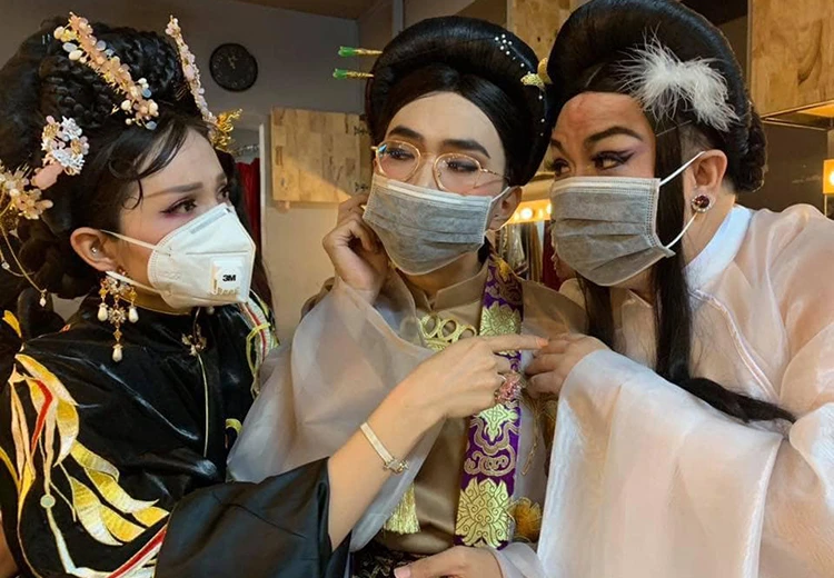 Các nghệ sĩ tham gia vở "Cuộc chiến sắc đẹp" của sân khấu Thế giới trẻ đeo khẩu trang trong hậu trường. Ảnh: KHẢ NHƯ