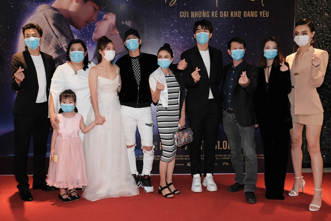 Dàn sao và nhà quay phim Linh Đan, đạo diễn Quang Bình (thứ hai và ba từ phải sang) đeo khẩu trang tại buổi công chiếu "Bí mật của gió", tối 31-1.