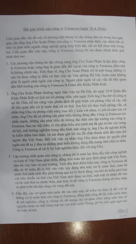 Phó Phòng đối ngoại Chu Xuân Phàm đã đứng lên, cúi đầu xin lỗi vì những phát ngôn "phản cảm" của mình. "Tôi đã có những phát ngôn không đúng, gây hiểu lầm, làm ảnh hưởng tới mối quan hệ giữa Formosa và chính quyền. Tôi xin nhận sai sót của mình", ông Phàm nói.