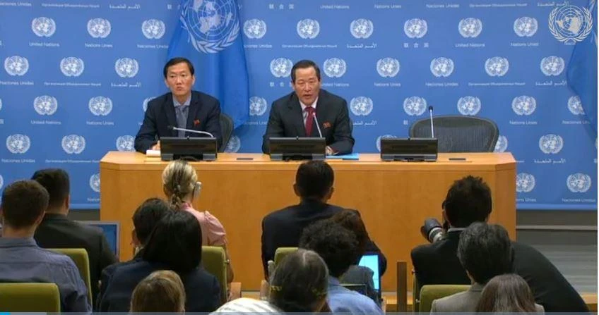 Đại sứ Kim Song chủ trì buổi họp báo bất thường tại trụ sở Liên Hiệp Quốc ngày 21-5. Ảnh: website LHQ