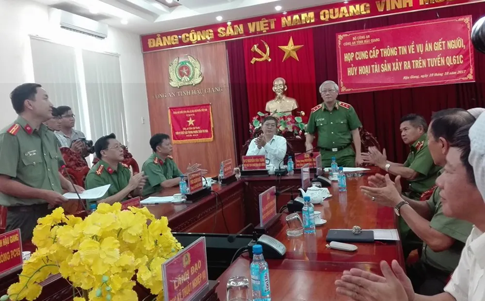 Thiếu tá Trần Nguyễn Hòa Thơ, Phó phòng Tham mưu Công an tỉnh Hậu Giang, tuyên bố lý do buổi họp là cung cấp thông tin về vụ án, đồng thời tổ chức khen thưởng đột xuất cá nhân và tập thể tham gia phá án.
