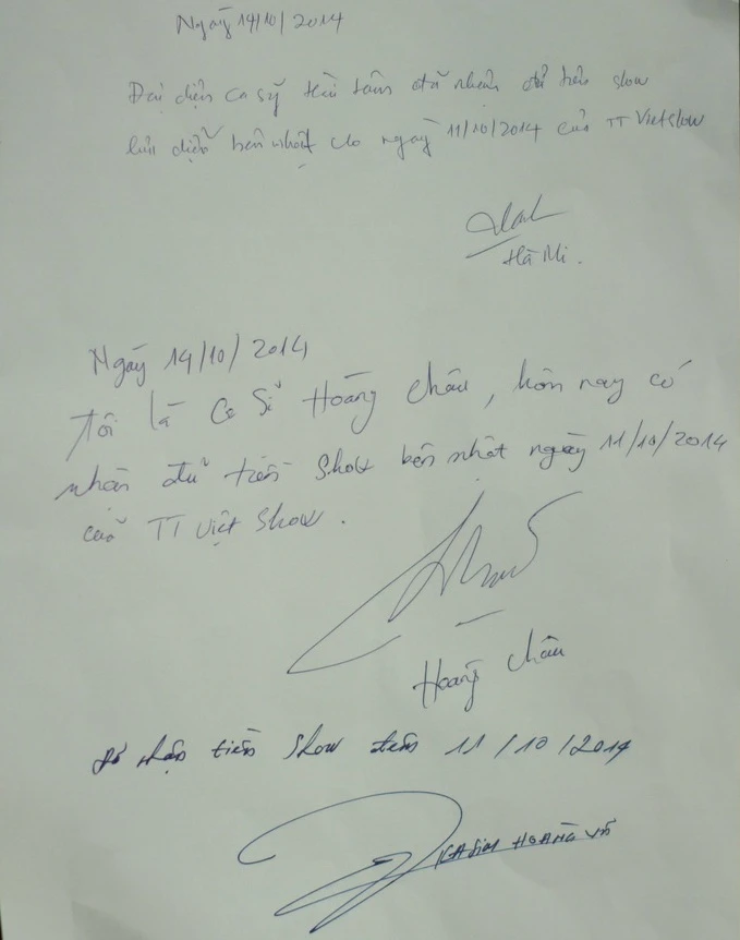 Bút tích ca sĩ nhận tiền thù lao đêm diễn ngày 11-10-2014 tại Nhật do Việt show cung cấp.
