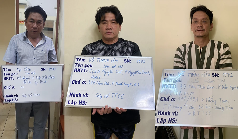 Theo đó, ba người mới bị bắt thêm gồm: Ngô Thiên (Trúc "nẫu", 50 tuổi), Võ Thanh Lâm (Lâm "sát thủ", 48 tuổi), Võ Thành Hiếu (48 tuổi, cùng ngụ tại TP.HCM). Cả ba bị khởi tố về hành vi gây rối trật tự công cộng.