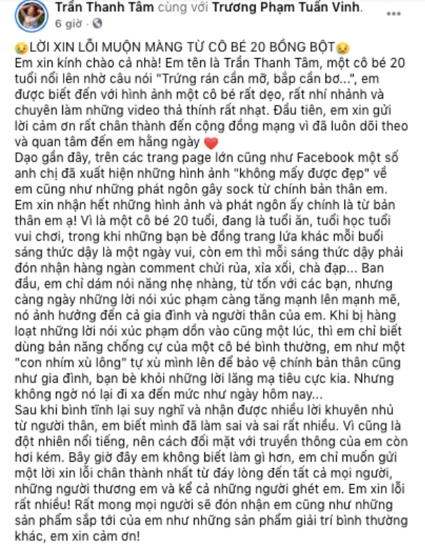 Nội dung bài viết là Tâm nhận lỗi vì những lỗi sai vừa qua đồng thời nói rằng mình còn trẻ nên mong muốn được tha thứ và đón nhận trong thời gian tới.