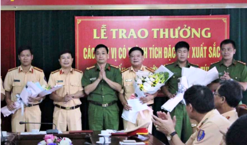 Đại tá Nguyễn Mạnh Hùng, Phó Giám đốc Công an tỉnh Nghệ An, biểu dương, tặng hoa và thưởng “nóng” cho Phòng CSGT Công an tỉnh Nghệ An và Công an huyện Thanh Chương.
