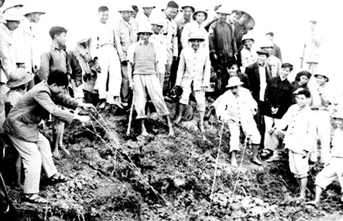 Bác là người hành động, nói ít chủ yếu là làm và cùng hướng mọi người đến hành động. Trong ảnh: Chủ tịch Hồ Chí Minh tát nước chống hạn với bà con nông dân ở cánh đồng Quai Chảo, xã Đại Thanh, huyện Thường Tín, Hà Đông (12-1-1958). Ảnh: TƯ LIỆU