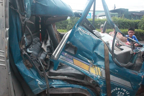 Cú tông mạnh khiến đầu xe tải nhỏ kẹt cứng vào đuôi xe, biến dạng hoàn toàn. Phụ xe kẹt cứng trong cabin. Người dân đưa nạn nhân đi cấp cứu nhưng phụ xe đã tử vong sau đó.