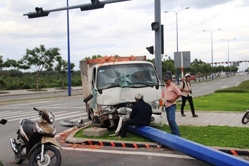 Sau khi va chạm, chiếc xe chở gạch đã lao lên dải phân cách, và chỉ dừng lại sau khi húc đổ một trụ đèn chiếu sáng.