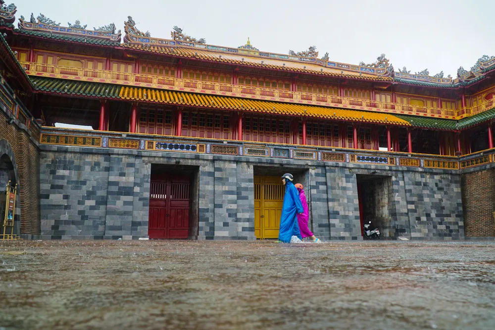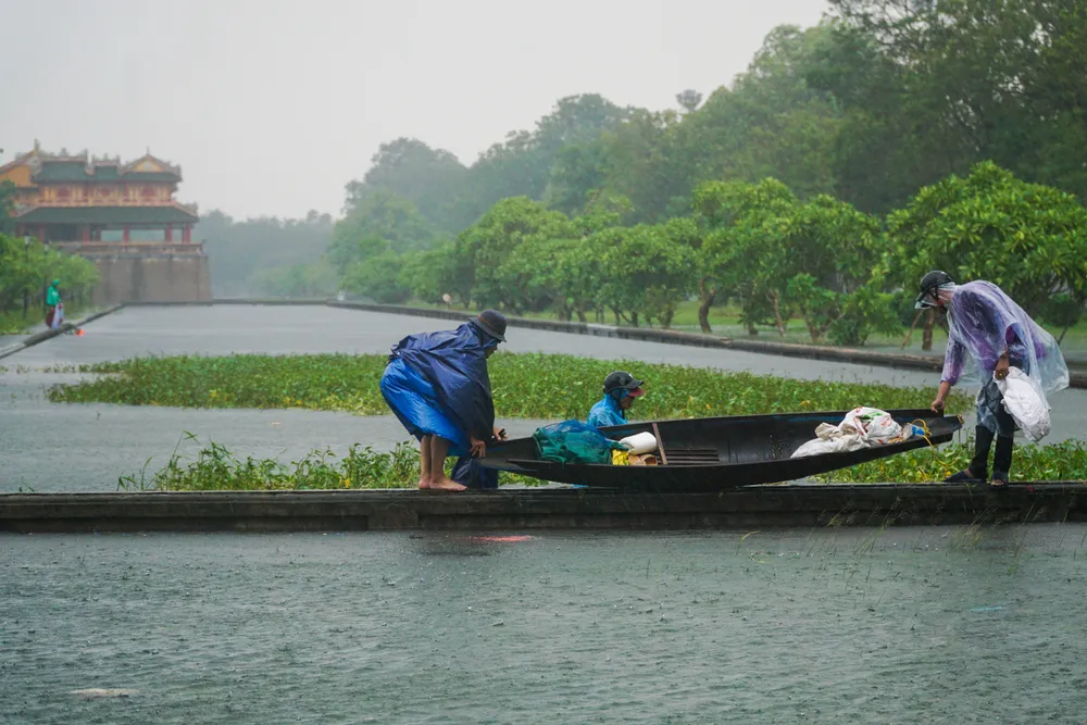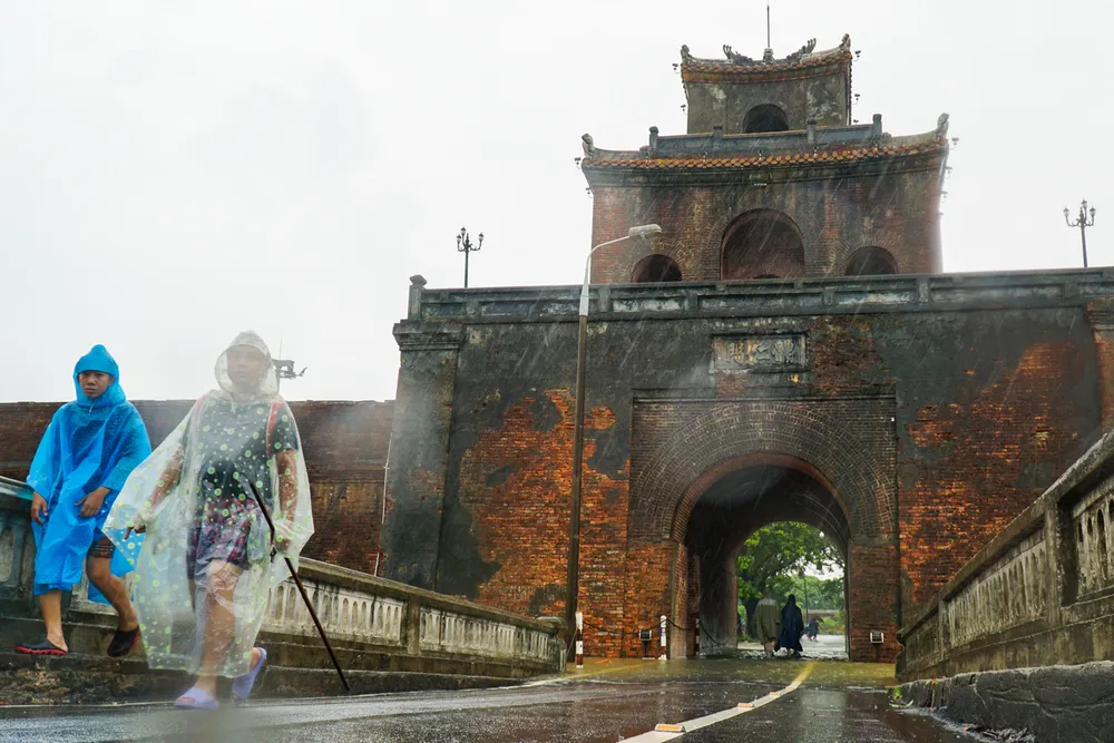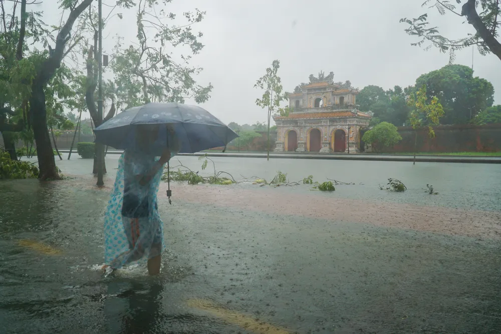 Vào thời điểm cơn mưa kéo dài, nước dâng cao ở một số lối vào gây khó khăn cho việc đi lại của người dân. Bạn Thái Trung (quê Quảng Nam) cho biết, đi dạo trong Đại nội Huế thời điểm này là một trải nghiệm thú vị. Ảnh: BÙI TOÀN