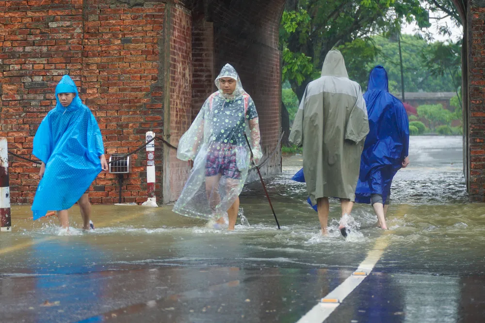 Phía trước Ngọ Môn (TP Huế) bị ngập do nước từ hồ Thái Dịch tràn lên bờ. Nhiều bạn trẻ vẫn đi dạo trong cơn mưa tầm tã. Ảnh: BÙI TOÀN