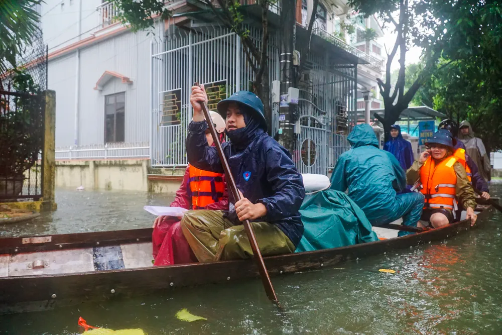 Mưa lớn làm nhiều khu dân cư gần Đại nội Huế ngập nặng, có nơi nước ngập sâu 1m. Các cán bộ địa phương dầm mưa chèo ghe đến từng nhà để trao đồ tiếp tế cho người dân. Ảnh: BÙI TOÀN