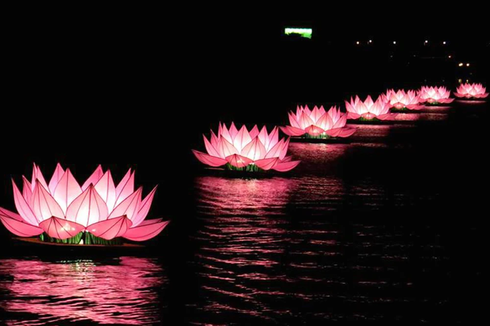 Bảy bông hoa sen trượng trưng cho bảy bước đi thanh tịnh của Đức Phật được thắp sáng trên sông Hương.