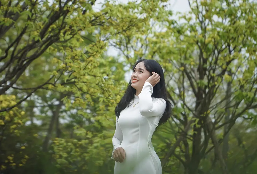 Du khách mặc áo dài chụp với vườn hoa mai trong kinh thành Huế. Ảnh: ND