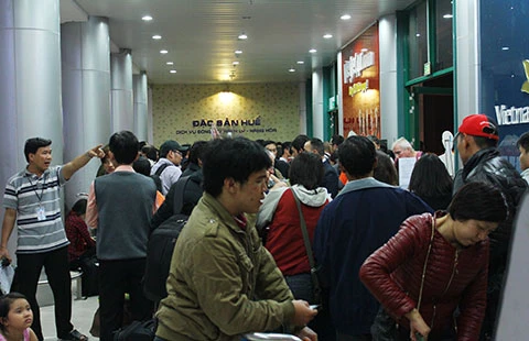 Gần 1.000 hành khách chờ được di chuyển từ sân bay Phú Bài vào sân bay Đà Nẵng để tiếp tục hành trình. Ảnh: THANH HOÀNG