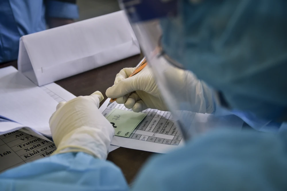 Những nhân viên Y tế đối chiếu lại các thông tin của các chiến sĩ được lấy mẫu. Ảnh: NGUYỄN DO