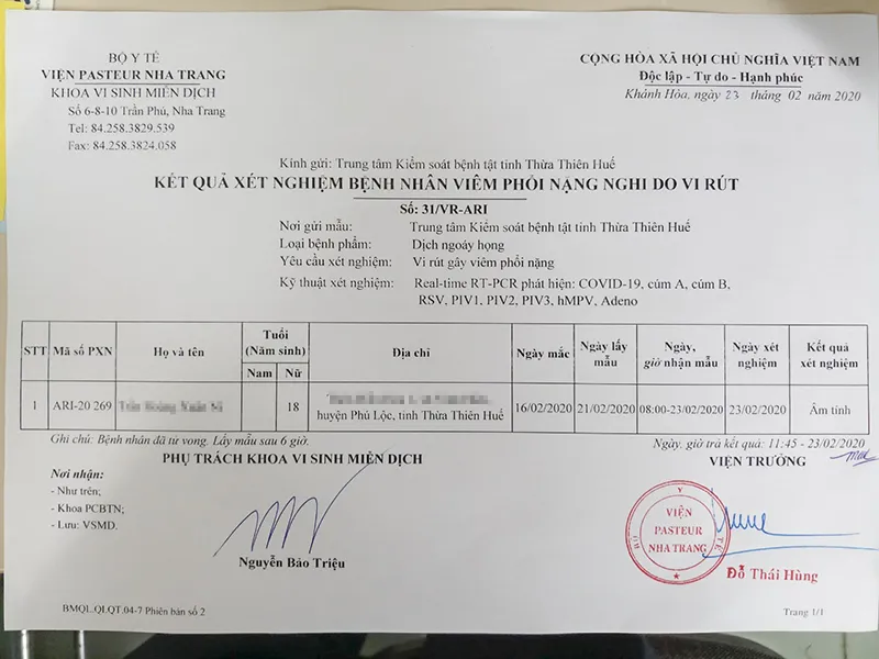 Kết quả xét nghiệm từ Viện Pasteur Nha Trang.