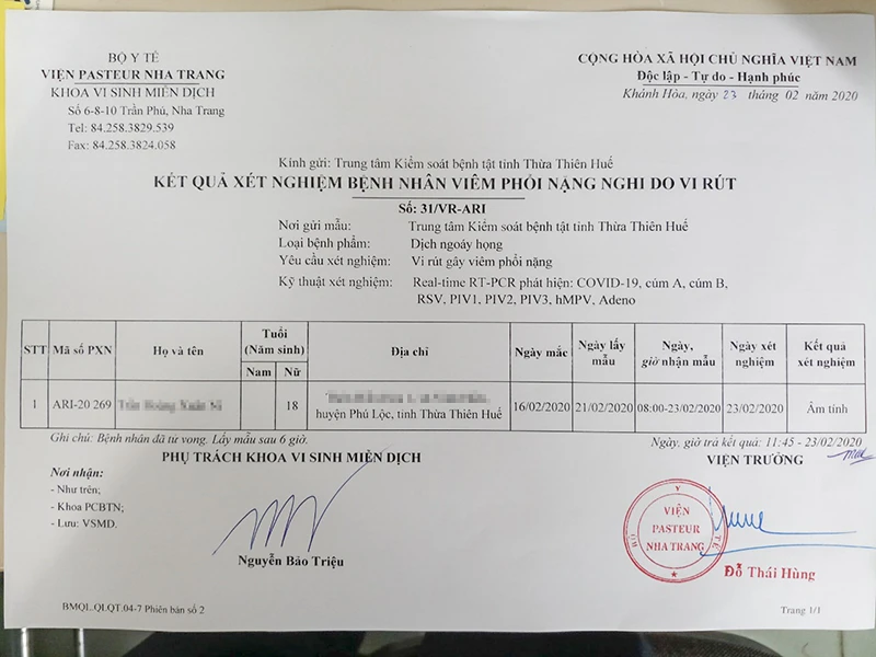 Ông Hoàng Văn Đức, Giám đốc Trung tâm Kiểm soát bệnh tật (CDC) tỉnh Thừa Thiên-Huế, cho biết kết quả vừa nhận được từ Viện Pasteur Nha Trang thì bệnh nhân N. âm tính với COVID-19 và các loại virus khác.