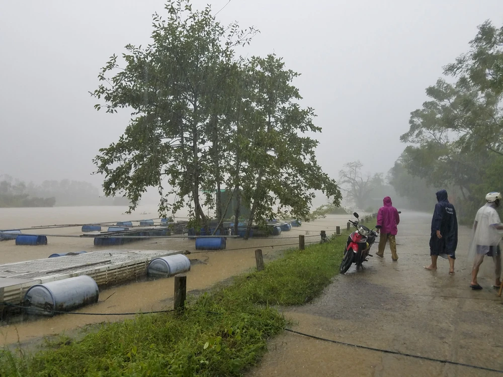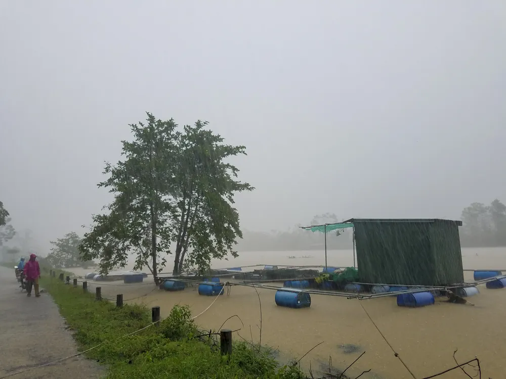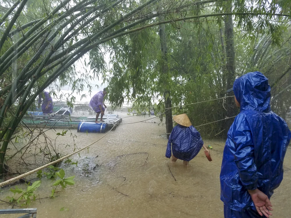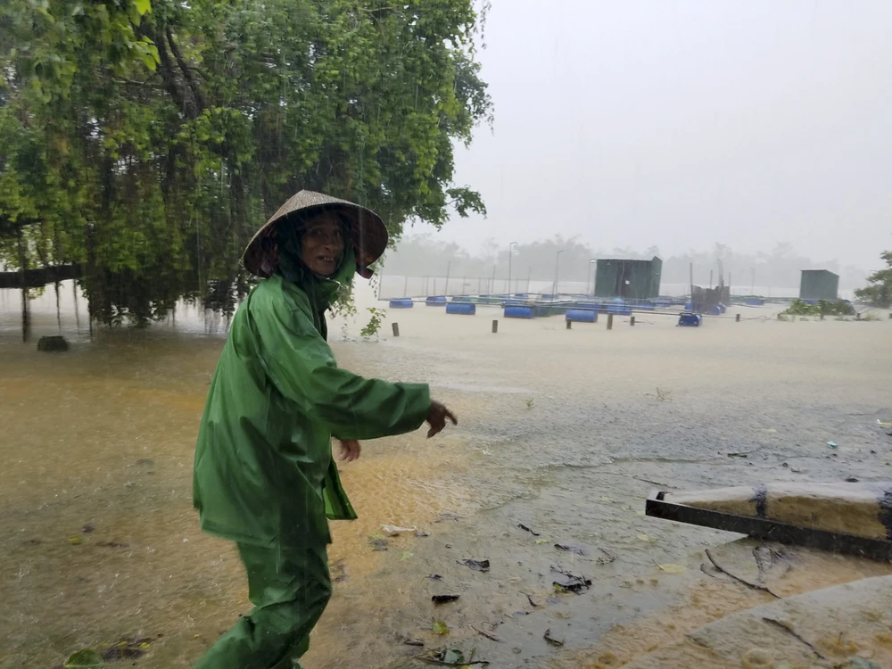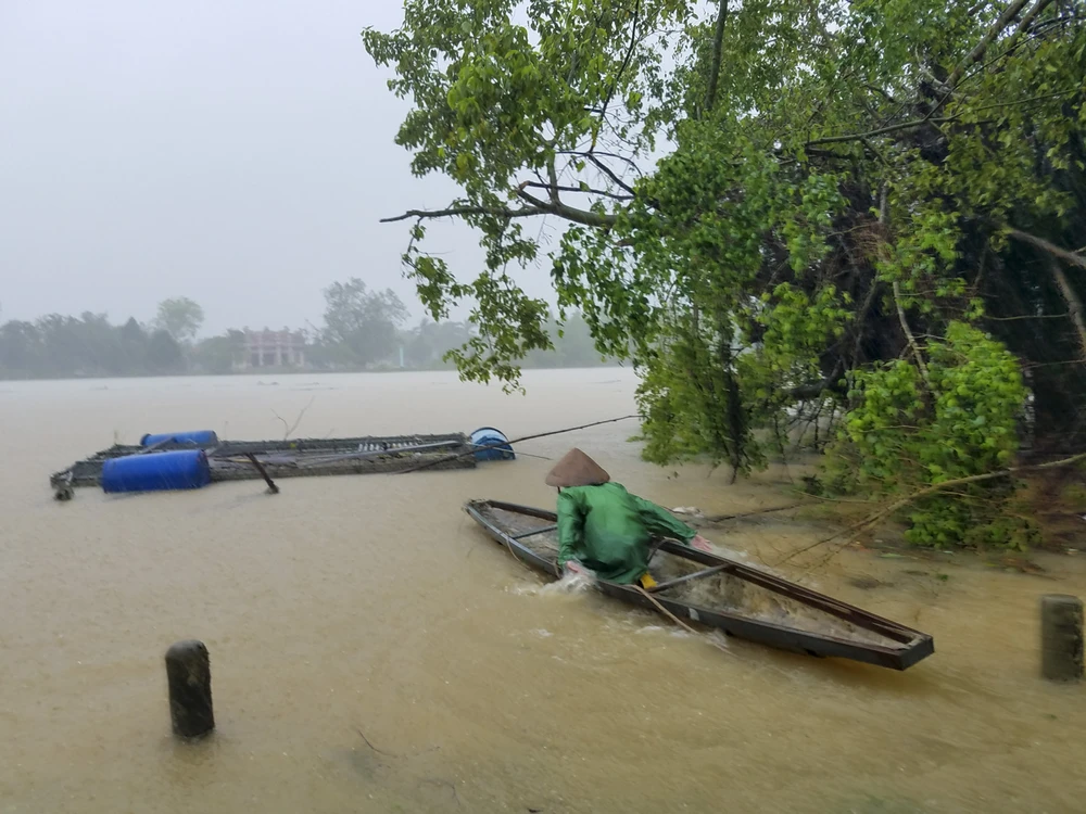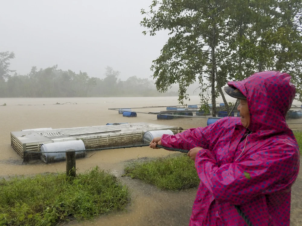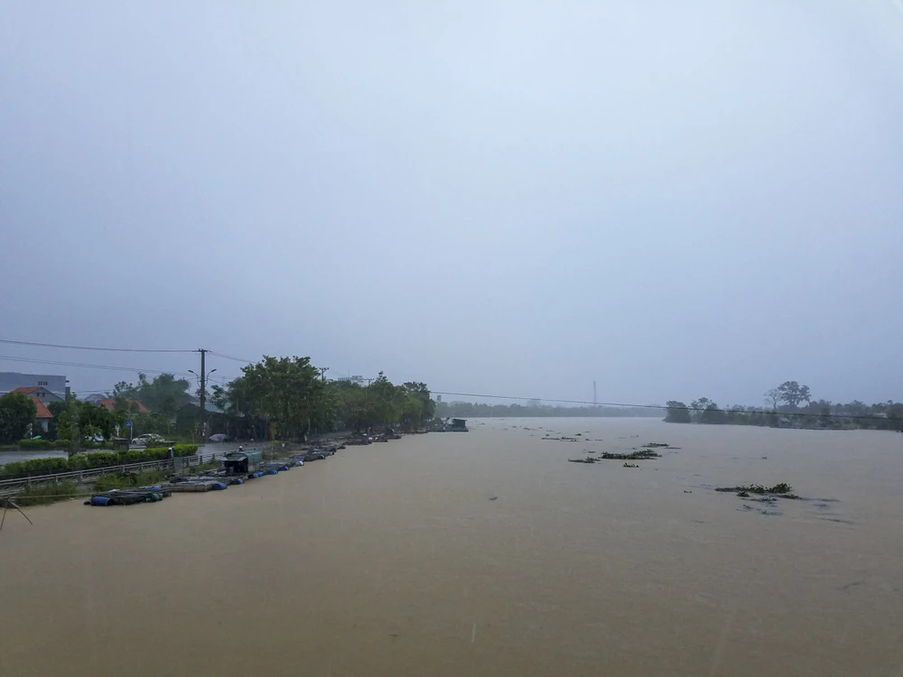 Sáng nay, nước trên sông Bồ (Thừa Thiên - Huế) lên cao, người dân nuôi cá lồng dọc sông căng mình chằng chống lại những lồng cá.