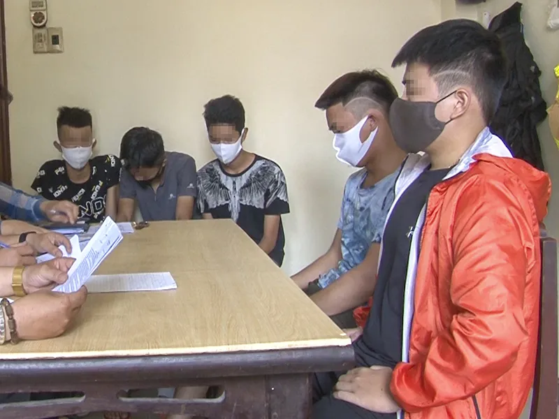Năm người bị Công an phường Phú Cát (TP Huế) xử phạt hành chính vì không đeo khẩu trang nơi công cộng. Ảnh: C.QUANG