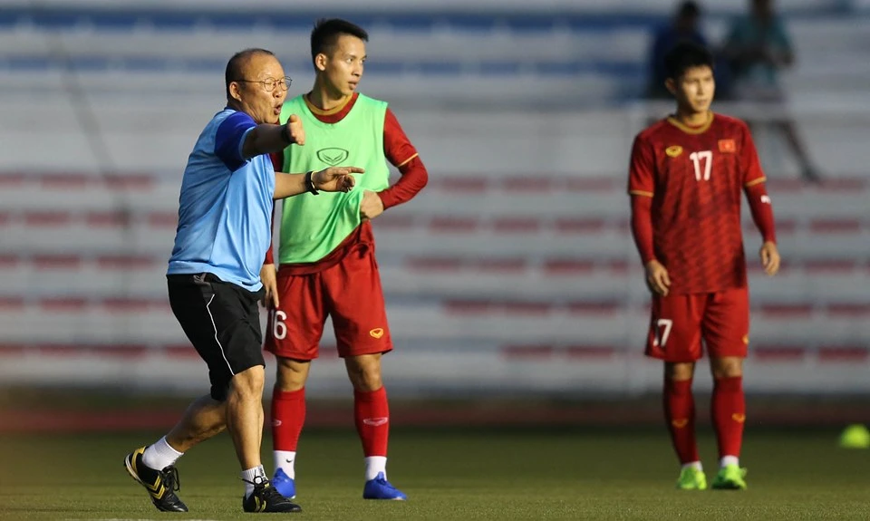 HLV Park Hang-seo đang thị phạm chiến thuật trên sân Rizal Memorial.