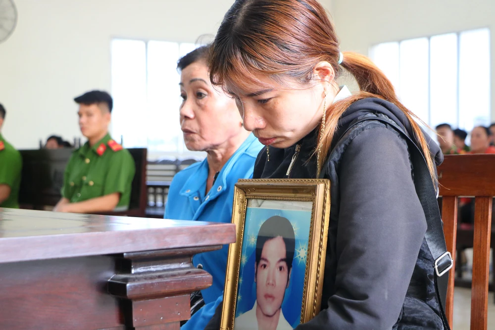 Gia đình anh Công mang di ảnh anh đến tòa. Ảnh: Lê Ánh