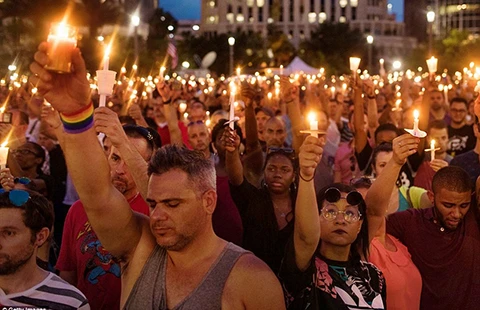 Đêm canh thức 13-6 ở Orlando, hàng ngàn người tưởng nhớ các nạn nhân vụ thảm sát. Ảnh: GETTY IMAGES