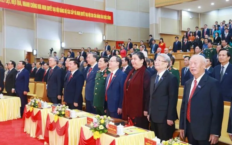 Các lãnh đạo Đảng, Nhà nước, Quốc hội dự Đại hội Đảng bộ tỉnh Hưng Yên làm lễ chào cờ. Ảnh: TTXVN