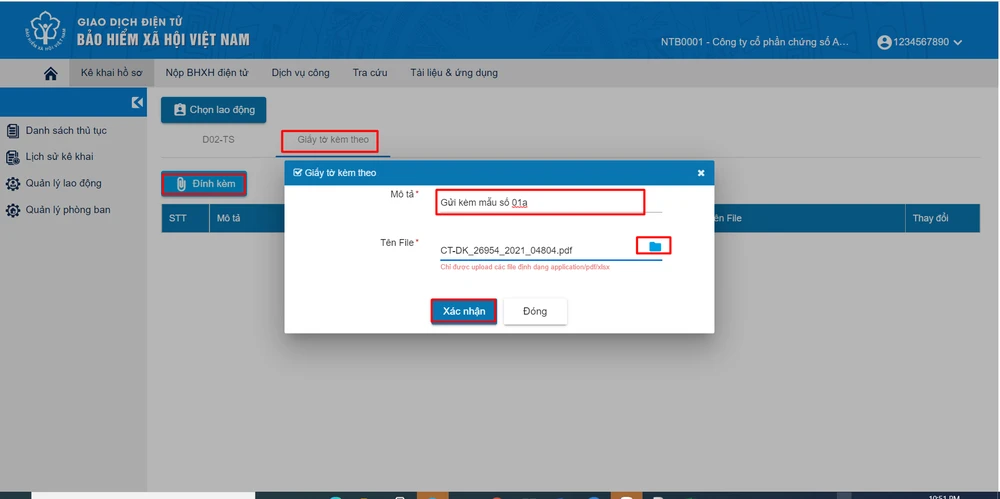 Bước 5: Thực hiện gửi kèm mẫu số 01 như hình sau và chọn Xác nhận.