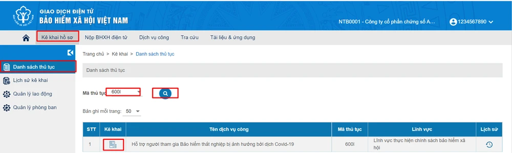 Bước 3: Tại màn hình: “Danh sách thủ tục”, chọn mã thủ tục “653 - Hỗ trợ người tham gia BHTN bị ảnh hưởng bởi dịch Covid-19” và chọn Kê khai.
