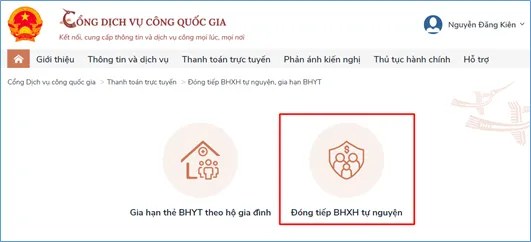 Việc thực hiện dịch vụ thanh toán trực tuyến “Đóng tiếp BHXH tự nguyện” cũng tương tự như dịch vụ Gia hạn thẻ BHYT theo hộ gia đình. Cụ thể như sau:
