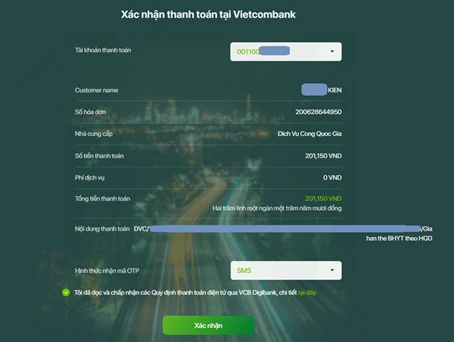 Các thao tác trên giao diện internet banking của ngân hàng bạn thực hiện tương tự như dịch vụ thanh toán “Gia hạn thẻ BHYT theo hộ gia đình”.