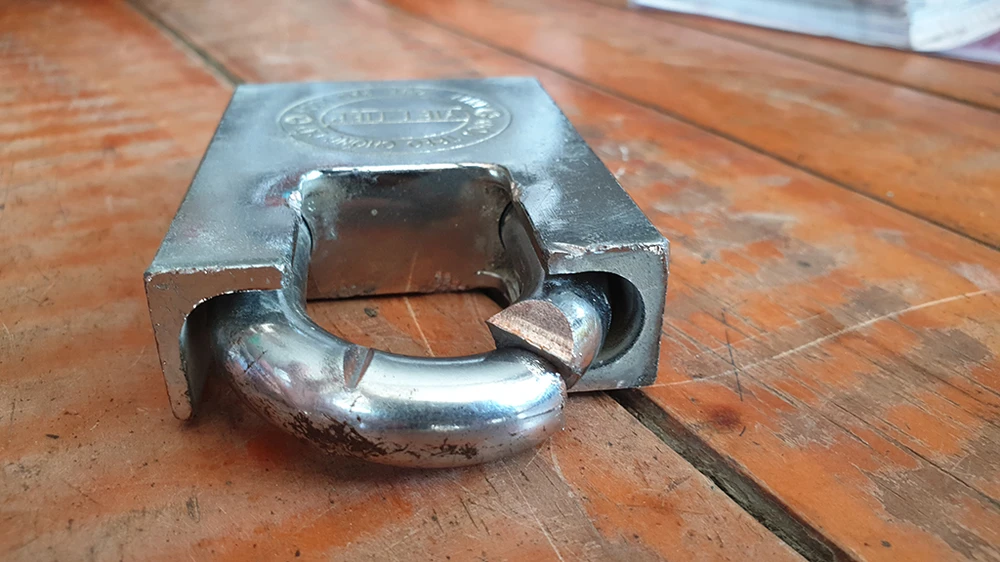 Ổ khóa loại chống cắt bị trộm cắt đứt. Ảnh: NT