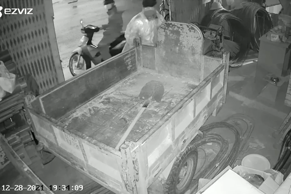 Nhóm hai thanh niên lấy đi một chiếc xe ba gác máy. Sau sáu phút, cả hai tiếp tục quay lại, lấy đi chiếc xe ba gác máy thứ hai.