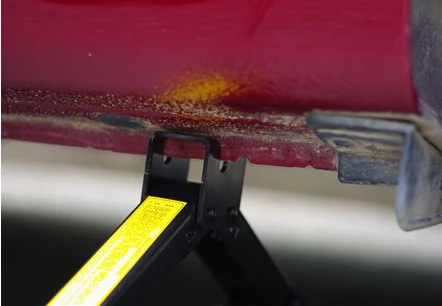 B5: Kích lốp xe ở đúng vị trí theo hướng dẫn, thường trên kích cũng có dán một sơ đồ chỉ dẫn nhỏ. Kích nâng bánh xe tách khỏi mặt đất một chút rồi hạ xuống vài chục mm đến khi bánh tỳ nhẹ xuống mặt đường sao cho nó không phải chịu tải lớn nhưng cũng không quay tự do. Cẩn thận, tránh làm chầy xước tay khi xoay bộ mở ốc.