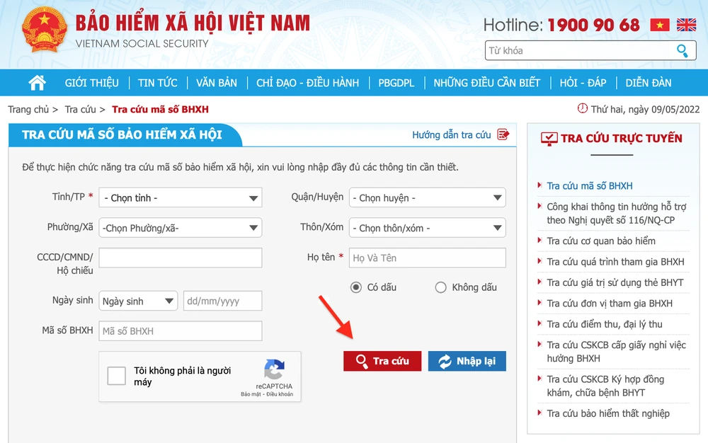 Bước 3: Nhập đầy đủ các trường thông tin theo yêu cầu. Lưu ý: Những mục có dấu * màu đỏ là những mục bắt buộc phải điền, không được bỏ trống. Sau khi nhập xong đầy đủ thông tin, chọn xác nhận “Tôi không phải là người máy” và bấm "Tra cứu".