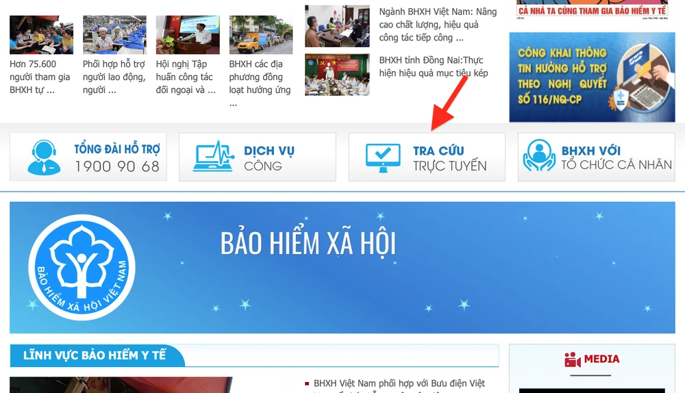 Bước 1: Truy cập vào trang web của cơ quan bảo hiểm xã hội Việt Nam tại địa chỉ: https://baohiemxahoi.gov.vn và kéo xuống dưới chọn mục tra cứu trực tuyến.