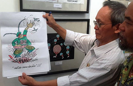 Họa sĩ biếm Hoàng Dzự giới thiệu một bức biếm họa của mình. Ảnh: VT
