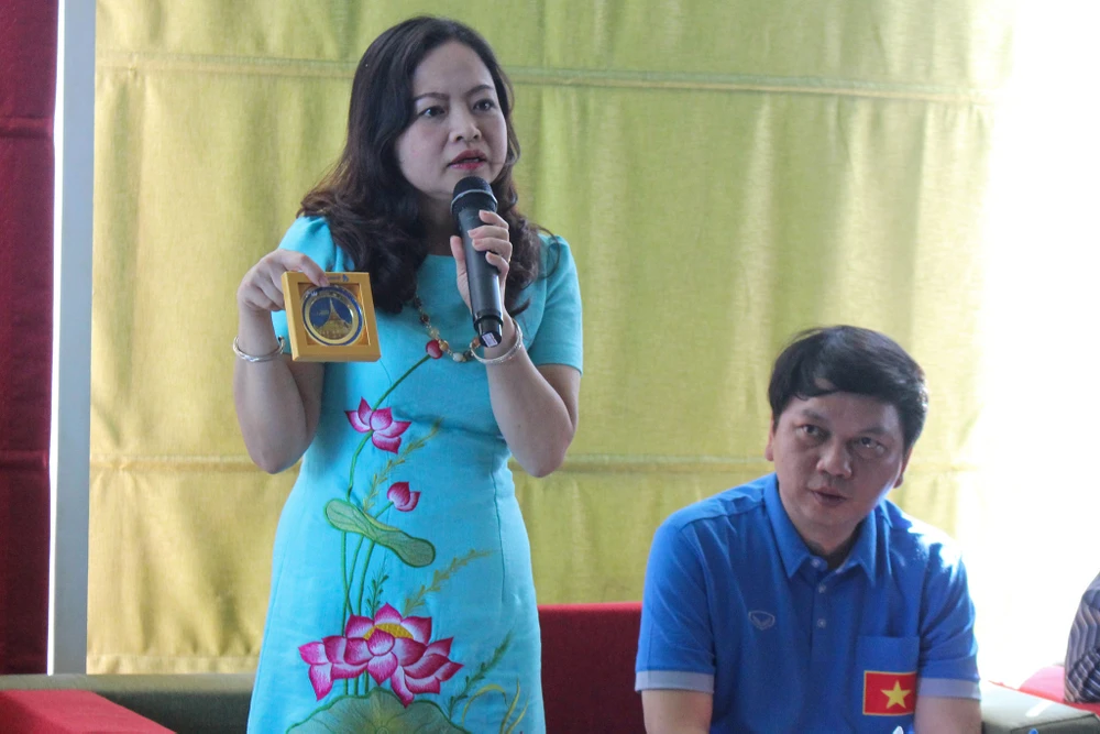 Đại sứ đặc mệnh toàn quyền Luận Thùy Dương gửi đến các cầu thủ món quà chùa Vàng - biểu tượng của đất nước Myanmar.