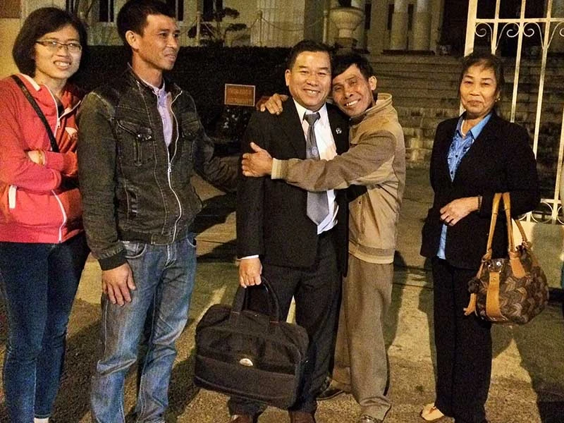 Gia đình bị cáo Trịnh Văn Chân vui mừng sau khi tòa phúc thẩm tuyên hủy án. Ảnh: NGÂN NGA
