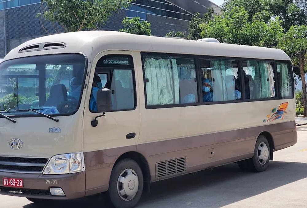Xe chở những du khách trên chuyến bay Daegu tới Đà Nẵng về điểm cách ly vào trưa 24-2. Ảnh: HOÀI AN