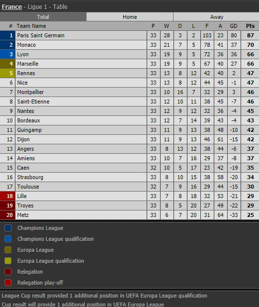 Trong khi đó, Monaco dù vẫn giữ được vị trí thứ hai với 70 điểm nhưng họ đã bị Lyon và Marseille (hai đội đều thắng ở vòng này) đuổi sát nút với khoảng cách 4 điểm.