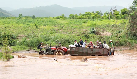 Người dân liều mình dùng xe cày đi qua suối sau khi cầu bị cuốn trôi.