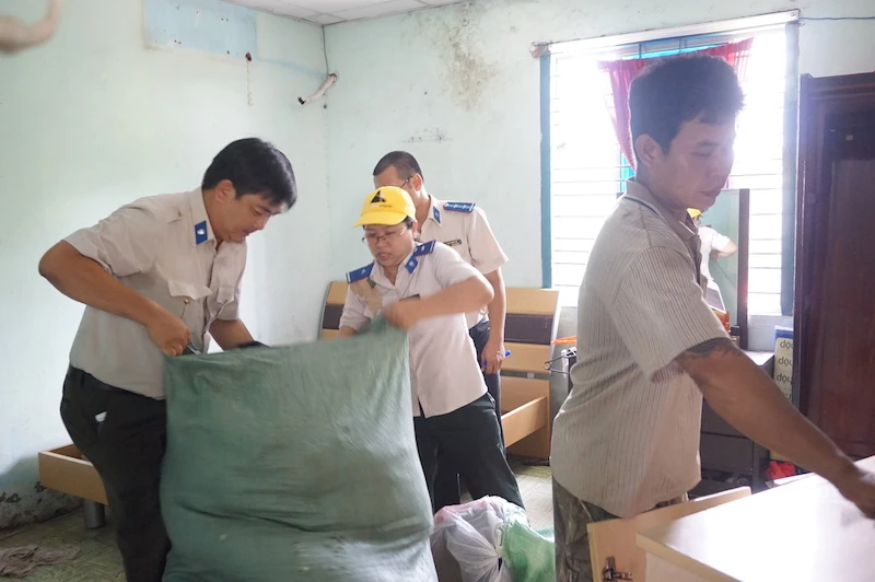 Chấp hành viên chung tay dọn đồ đạc phụ cho các hộ dân. Ảnh: NGÂN NGA