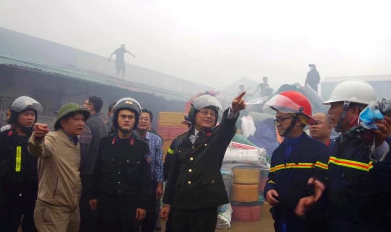 Đại tá Nguyễn Hữu Cầu, Giám đốc Công an tỉnh Nghệ An, chỉ đạo chữa cháy tại hiện trường.
