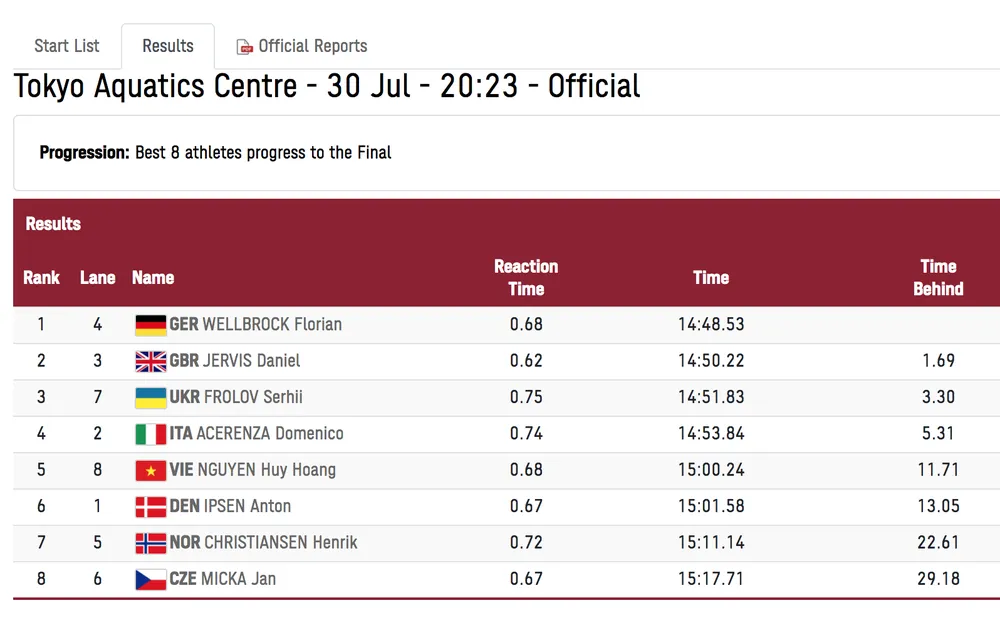 Huy Hoàng xếp hạng 12/28 VĐV dự tranh vòng loại 1.500 m tự do tại Olynpic Tokyo. ẢNH: GETTY