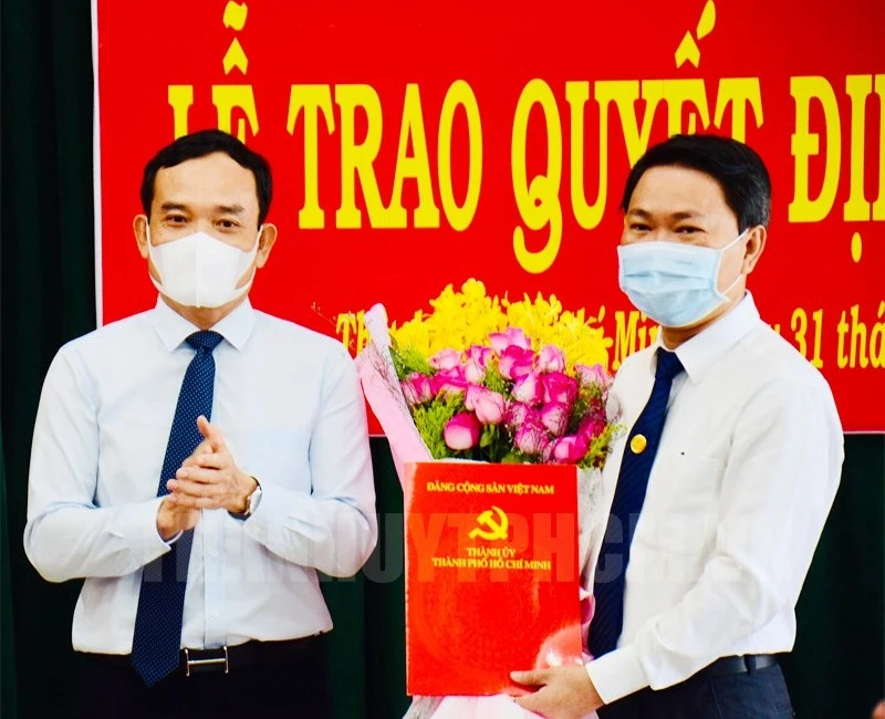 Phó Bí thư Thường trực Thành ủy TP.HCM Trần Lưu Quang trao quyết định và tặng hoa chúc mừng ông Trần Hoàng Quân. Ảnh: Web Thành ủy TP.HCM.