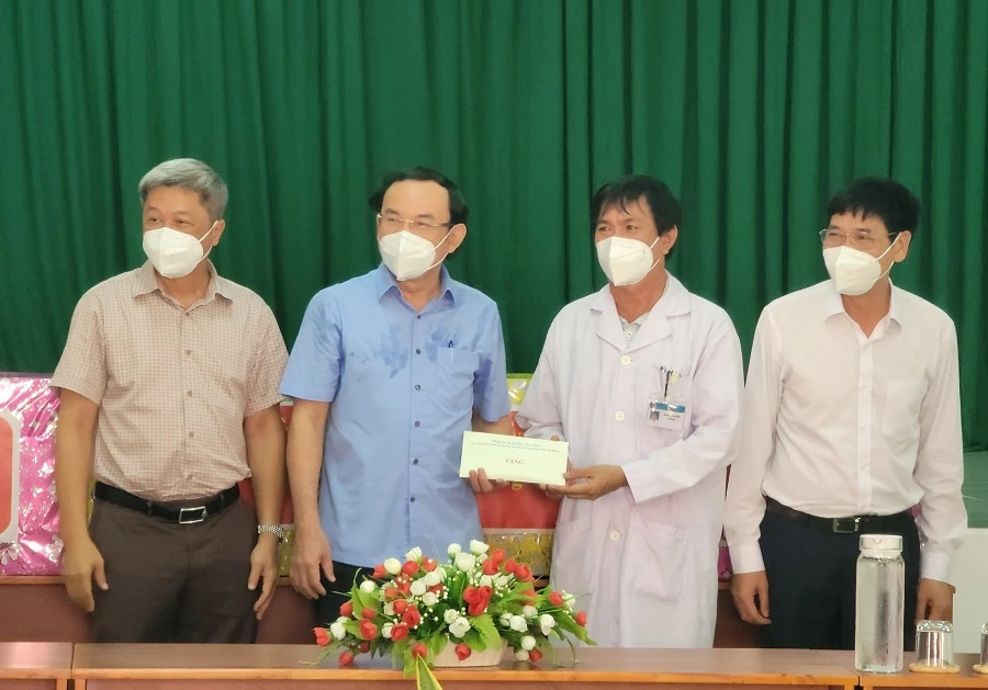 Bí thư Thành ủy Nguyễn Văn Nên tặng quà cho Bệnh viện điều trị COVID-19 huyện Cần Giờ. Ảnh: TÁ LÂM